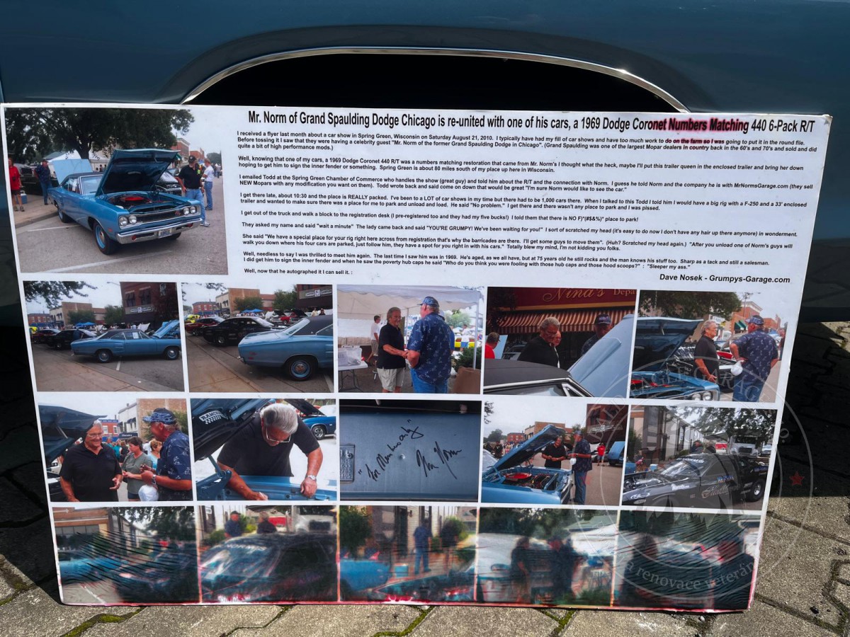 Podrobný popis1969 Dodge Coronet R/T 440 Six-Pack zakoupený v Grand Spaulding Dodge u legendy amerického motorsportu Mr.Norma Krause! Jeden ze 4 810 Coronetů R/T vyrobených s kombinací 440/Automatic a jeden z méně než 100 R/T s odstraněnými zadními pruhy v roce 1969. Kompletní renovace dokončena v roce 2008 za cenu 100 000 $. Veškeré účtenky a dokumentace z renovace jsou součástí prodeje. Podepsaný samotným Mr.Normem. Původní motor a převodovka. Posilovač řízení, posilovač kotoučových brzd, tovární tachometr, tovární sportovní kola, skořepinová sedadla se středovou loketní opěrkou, poziční trakce 8.75 Sure Grip, bezpečnostní pásy, Tic Toc tach, AM rádio, duální výfuk, dálkové zrcátko, tónovaná skla, kapota air grabber, vinylová střecha, ocelová kola s nerezovými kryty, automatická převodovka Torque Flite a motor 440 Hi Po. Úpravy a upgrady během restaurování za účelem zlepšení výkonu a vzhledu zahrnují přední kotoučové brzdy s dvojitým pístkovým třmenem, .030 overbore na motoru, portované a leštěné hlavy, .512 zdvih hydraulickou vačku a ventilový rozvod, válečková vahadla, hlavičky, 3" výfuk, MSD blaster coil , nová palivová nádrž a potrubí, 7litrová olejová vana, nové odpružení a mnoho dalšího Toto auto je připraveno na show a určitě potěší! Vůz je na veteránských značkách.